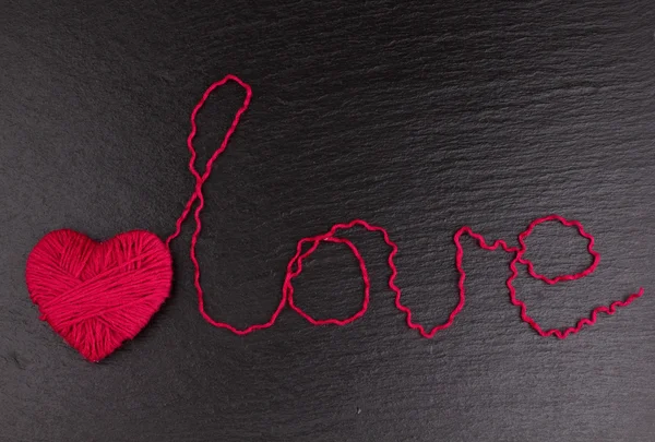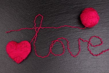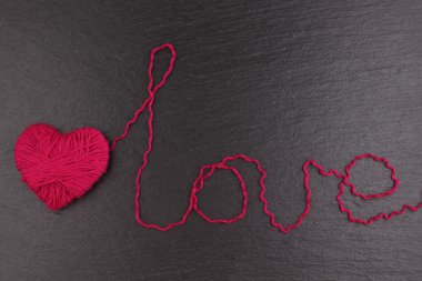 "Yün siyah arka plan üzerine yapılan aşk" kelimesine ile kalp şeklinde kırmızı clews