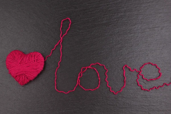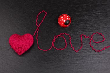 "Yün siyah arka plan üzerine yapılan aşk" kelimesine ile kalp şeklinde kırmızı clews