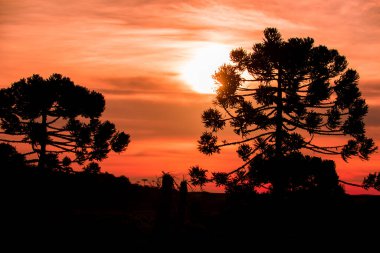 Günbatımı ağaç siluet, kırmızı güneş dağ üzerinde