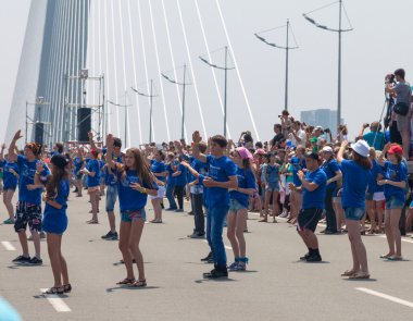 Aktörler mavi halı üzerinde bekleyen çocuklar