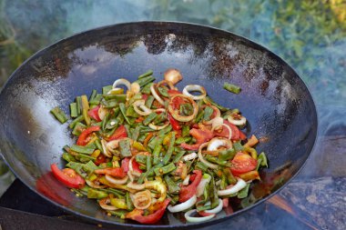 Raditional İspanyol yemeği paella ile karides ve midye pişirme
