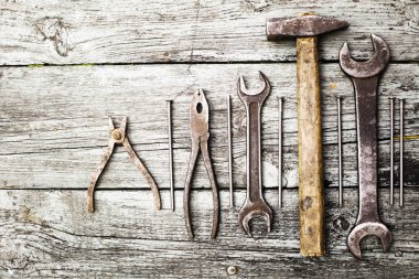 İnşaat araçlar kümesi. Ahşap arka plan üzerinde anahtarı