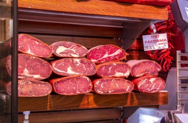 Paris'te sokak pazarında etler sattı. Yürüyüş ve gıda satın insanlar