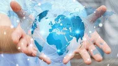 Küresel ağ seyyare yerküre 3d render tutan işadamı