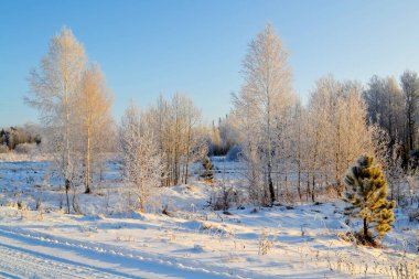 güneşli havalarda. Kış orman manzarası, kar
