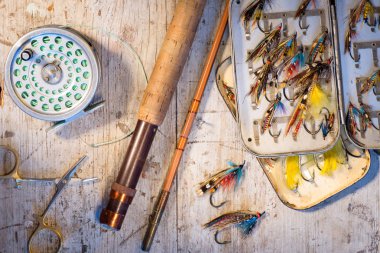 Bir tablo üzerinde balık tutmak için ekipmanlar
