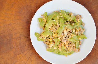 Fried acı kavun yumurta ve domuz pastırması ile karıştırın