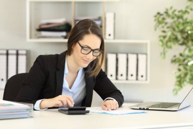 Hesap makinesiyle ofiste çalışan bir muhasebeci.