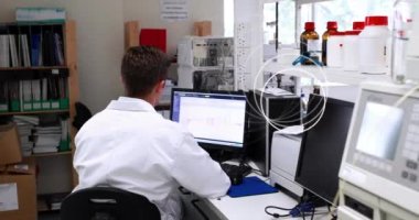 Kazan, Tataristan/Rusya - 20 Aralık 2016: Kamera genç ciddi laboratuvar asistanı aracı işletim ve notlar 20 Aralık kazan klasöründe yapma bakarak gösterir