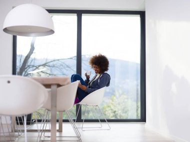 kahve içme ve evde bir cep telefonu kullanarak siyah kadın