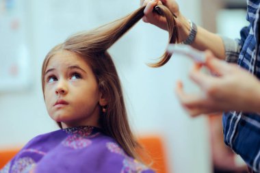 Makas Kuaför Saç kesme sırasında bakarak küçük kız
