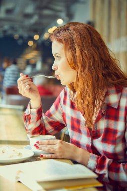 Kızıl saçlı kadın kahve dükkanında kitap okumak gülümseyen
