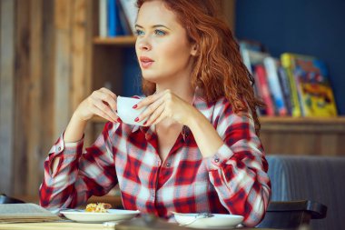 Kafede güzel kızıl saçlı kadın. Blogger iş kavramı