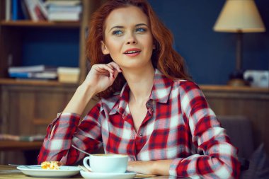 Kızıl saçlı kadın kahve dükkanında kitap okumak gülümseyen