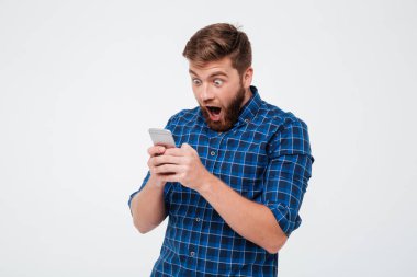 Kareli gömlekli smartphone kullanarak şaşırmış adam