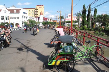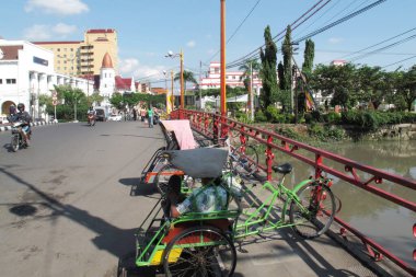 Hue, Vietnam - 13 Eylül 2017: köprüyü geçtikten ve omuzlarını içinde Hue, Vietnam yemekleri taşıyan kimliği belirsiz bir kadın