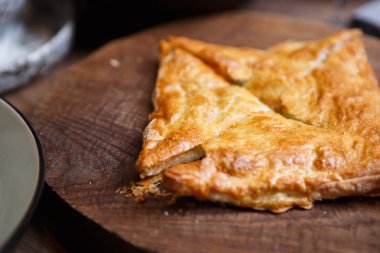 Çay ile ahşap tahta üzerinde lezzetli pasta bir parça
