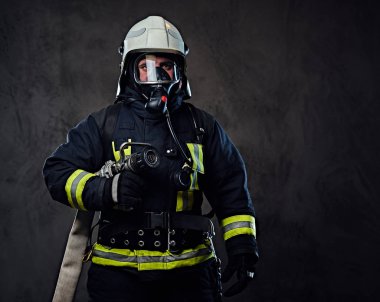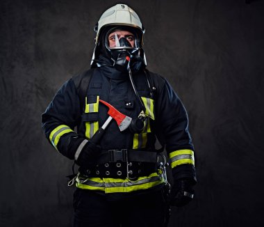 İtfaiyeci üniformalı bir kırmızı balta tutar.