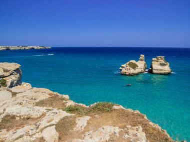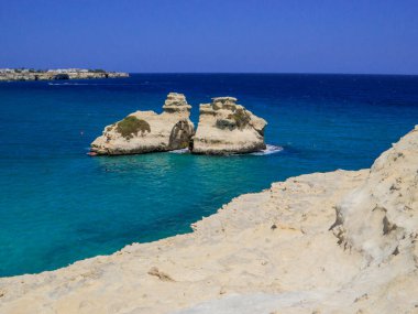 Apulia en güzel sahil: Torre Dell'Orso Bay, İtalya (Lecce). : Salento, tipik deniz manzarası: iki görünümünü yığar denilen iki kız kardeş (veya son Sorelle)