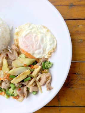 Tayland baharatlı yemekleri: bir tabak domuz stir fry ile sebze ve pirinç ahşap masa üzerinde beyaz tabak kızarmış yumurta. sağlıklı yemek.