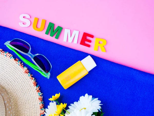 "Güneş gözlüğü, yaz şapkası, güneş kremi losyonu ve pembe arka plan üzerinde çiçekler ile Yaz" alfabeleri. Tatil ve dinlenme, yaz seyahat konsepti.