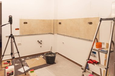 Temel yükleme çeşitli aşamalarında Island merkezi mutfak dolapları montajı için özel mutfak dolapları