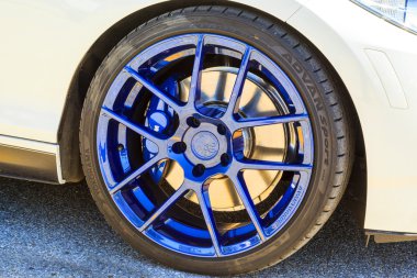 Üzerinde siyah bir yansıtıcı araba ve güneş bu altın cıvata ile mavi jantlar