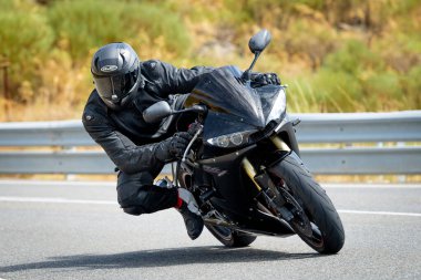 Motorcu siyah ceket ve sportif bisikletini mavi zemin üzerine oturan kask