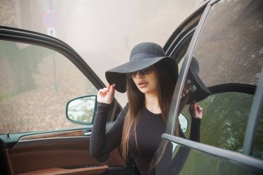 Sonbahar parkta bankta oturmuş bir şapka ile siyah montlu zarif kadın