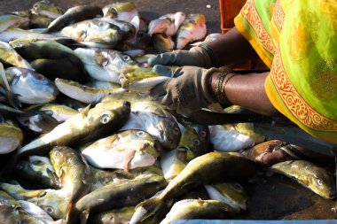 Balıklar ve deniz ürünleri farklı türde closeup Güney Hindistan'da balık pazarında satılan