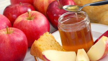 Still life closeup - challah, apples, pomegranate and bowl of ho