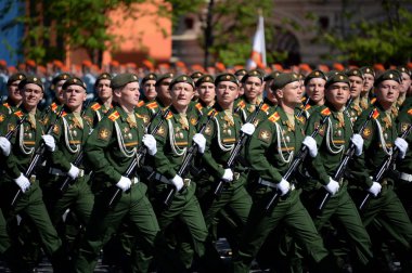 2 muhafız motorlu tüfek Taman Division askerleri kırmızı kare üzerinde geçit onuruna Zafer Bayramı sırasında.