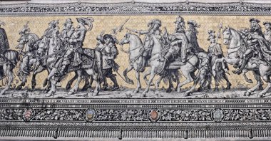 Dresden, Almanya - 10 Mayıs 2018: Fuerstenzug (Princes alayı), boyalı Meissen Duvar Mozaiği hükümdarlar Saksonya isimli eserleri takip etti döşer. Resmin genel sokak görüldü.