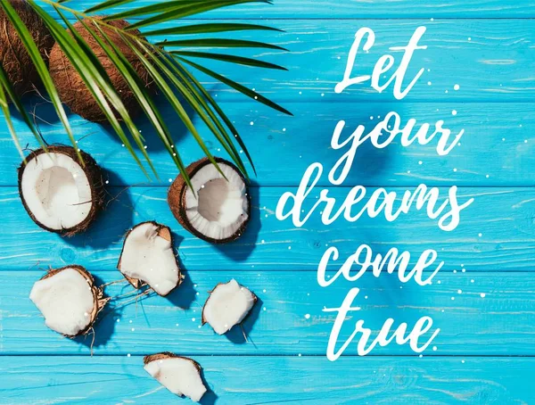 "Hayallerinizi izin" yazı ile turkuaz ahşap yüzeyde üstten görünüm hindistancevizi ve yeşil palmiye yaprakları