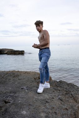 Sıcak yaz gününde gömleksiz atlama Genç Yetişkin erkek