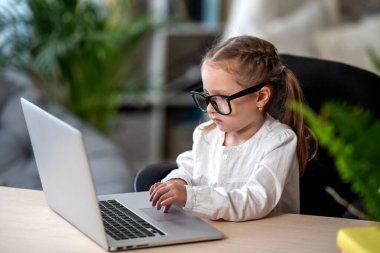 evde masada dizüstü kullanarak küçük çocuk portresi
