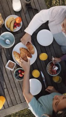 Çift balkonda having kahvaltı.