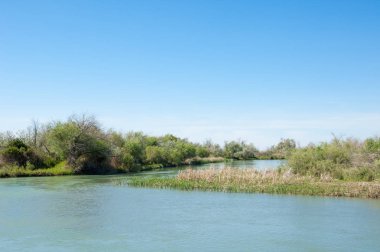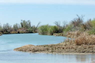 Bozkır nehir sazlık yaz. nehir görünümünde kez izlendi. küçük mavi nehir kıyısında güneşli bir gün