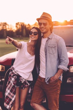 Eller yukarı cabriolet araba ile çift. Yol yolculuk seyahat konsepti.
