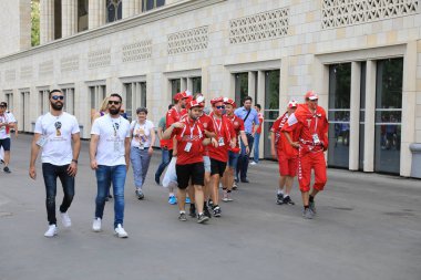Moskova, Rusya - 26 Haziran 2018: Fransa ve Danimarka Luzhniki Stadı nda arasında Dünya Kupası C grubu oyun sırasında kutluyor Fransızca ve Danimarka hayranları