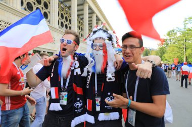 Moskova, Rusya - 26 Haziran 2018: Fransa ve Danimarka Luzhniki Stadı nda arasında Dünya Kupası C grubu oyun sırasında kutluyor Fransızca ve Danimarka hayranları