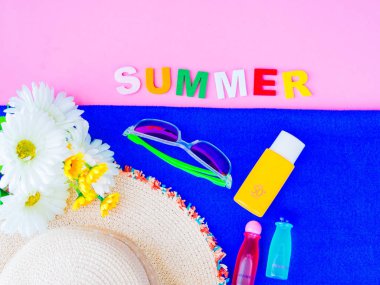 Yaz kurulum çiçekler, meyveler, deniz tuzu hafif bir arka planda üstten görünüm