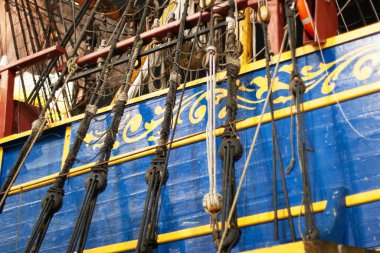 Barcelona, İspanya - 11 Ocak 2018: Expositions Deniz Müzesi'nde bulunan bina güvenleri ve Port Vell bölgesinde Deniz Kolordu eski gemi limanda şehrin içinde.
