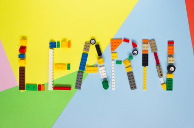 Kelime öğrenmek çok renkli ahşap mektup ahşap masa üstünde üzerinden.
