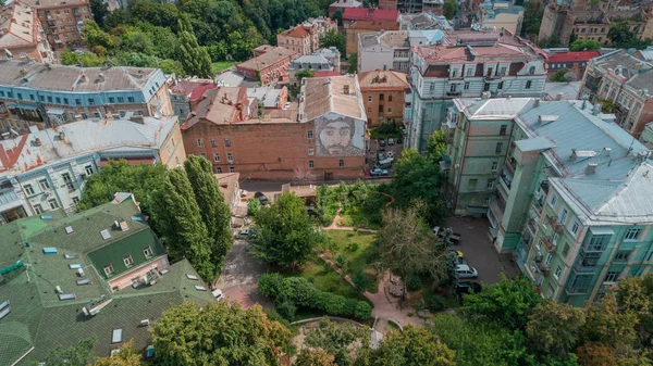 "İlahi yüzlerce" kare. 8 Ağustos 2018. Kiev (Kiev). Ukrayna. Havadan görünümü grafiti. Park. Binaların çatıları. Mikhailovskaya Meydanı.