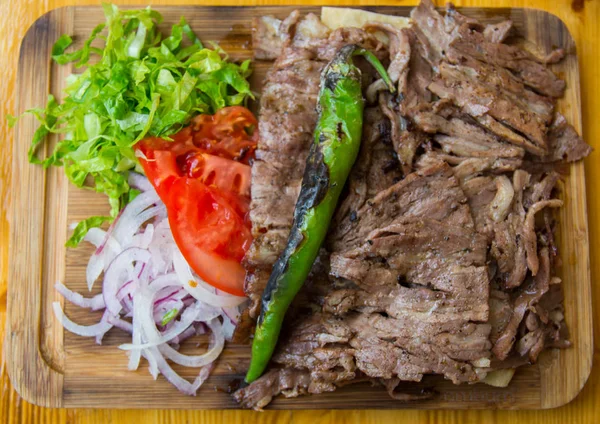 "Doner(Rotary) kebap"tahta üzerinde taze yeşillikleri ile servis edilir.