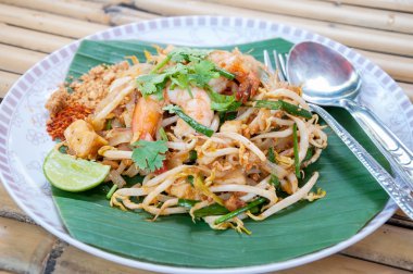 Tayland, tavada kızartılmış erişte dokuma ahşap plaka üzerinde karidesli yastık