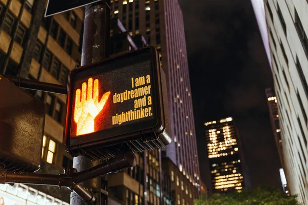 "Ben bir müzisyen ve bir nightthinker" ile new york trafik ışığı görünümünü yakın yazı, insan işaret ve gökdelenler, ABD