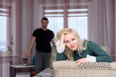 Cama odada oturan koca karısıyla kavramı ve savunuyorlar. Onlar fotoğraf ortasında ve bir şey hakkında konuşabilir.