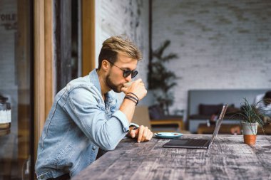 genç çekici iş adamı için bir dizüstü bilgisayar, bir kafe eserlerinde kahve içiyor.